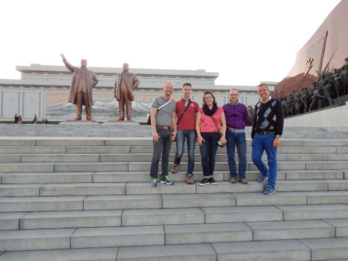 poseren met de groep bij het Mansudae Grand Monument waar de beelden staan van de overleden leiders Kim Il Sung en Kim Jong Il.