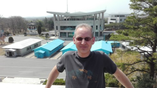 op de foto bij de zwaarbewaakte grens tussen Noord-en Zuid-Korea genaamd de DMZ bij Panmunjom.